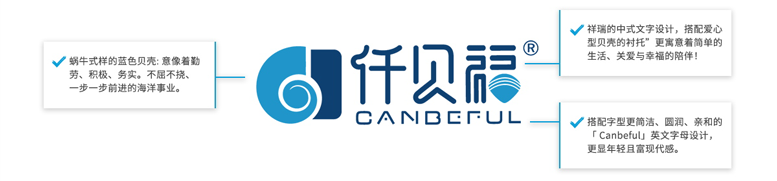 品牌識別的嶄新設計以「海洋」為主體,商標的主體是福字型 海洋貝殼+中式文字的仟貝福+現代簡約英文Canbeful √ 蝸牛式樣的藍色貝殼: 意像著勤勞、積極、務實。不屈不撓,鍥而不舍,一步一步前進的海洋事業。 √ 祥瑞的中式文字設計,搭配愛心型貝殼的襯托”更寓意著 簡單的生活 關愛與幸福的陪伴! √ 搭配字型更簡潔、圓潤 親和的「 Canbeful」英文字母設計,更顯年輕且富現代感。