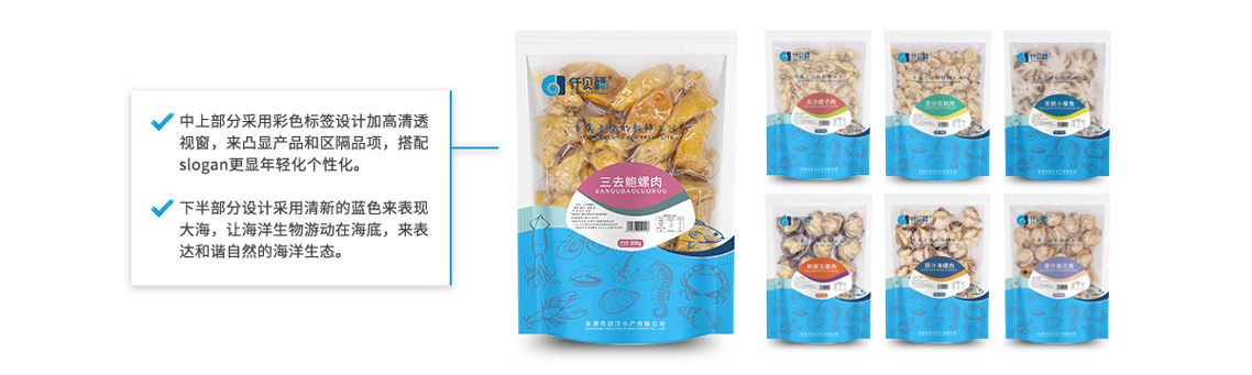 包裝的外觀設計主體為藍色海底色,搭配矢量寫實海洋生物,如同包裝內的新鮮海鮮食材 ,傳達著自然、美味、安心的產品特色與信息。中上部的Slogan 凸顯出 專屬 個性化的體驗理念。從中央往外延伸出的雙拼色帶,則以青春,悅動的色彩表現,作為各產品系列品項之間的區隔。 整體而言,品牌識別與產品包裝設計希望以更個性化、青春自然、現代感的視覺風格,營造出一種天然海洋的自然感受,精準的傳達它將作為消費者生活中「小新鮮」的幸福角色。
