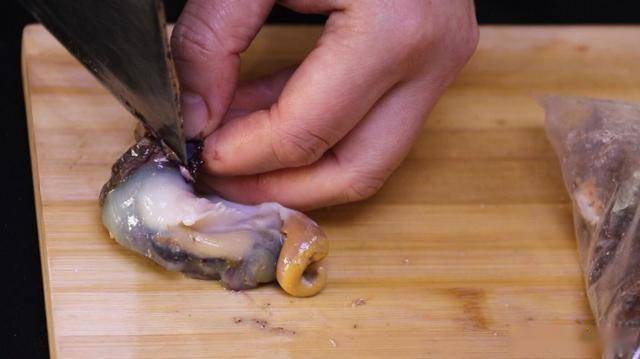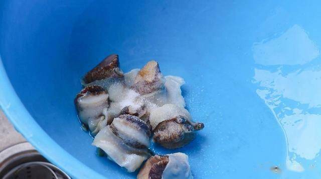 摘除螺肉中間的內臟和尾部,我們只取海螺的頭部,用鹽抓洗揉搓,搓出黏液,再用清水清洗干凈。
