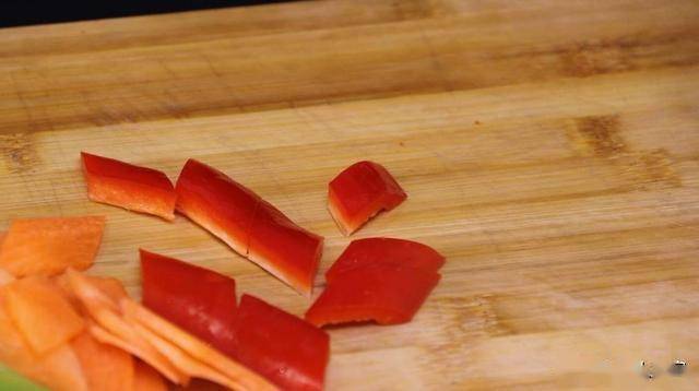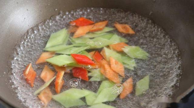 鍋內換清水,燒開。倒入切好的紅椒、胡蘿卜、萵筍,焯個20秒撈出。